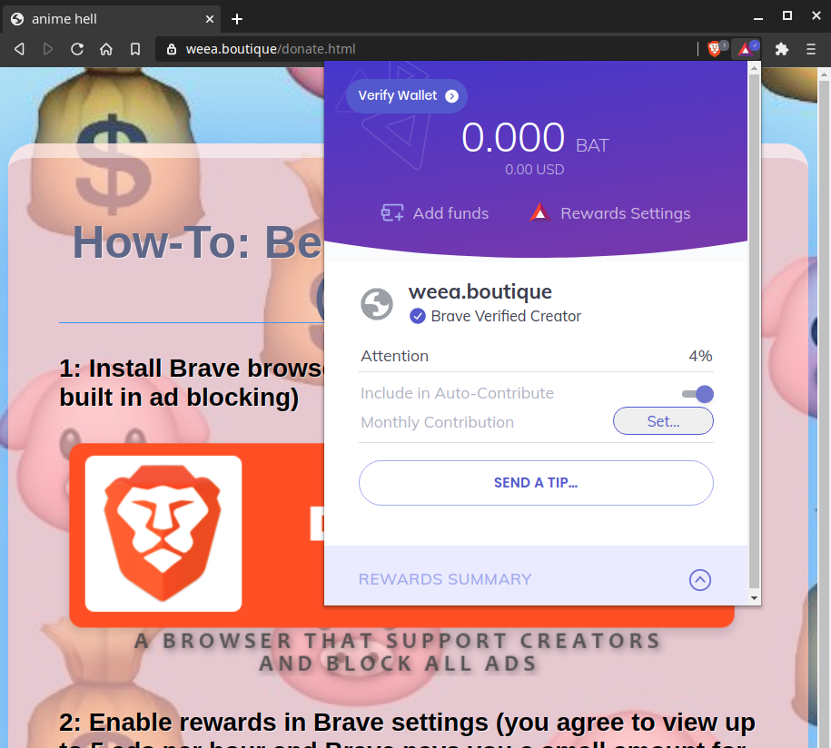 3: Click the Brave rewards triangle next to the URL bar and become a paypig with your ad money. You can even set up automatic donations